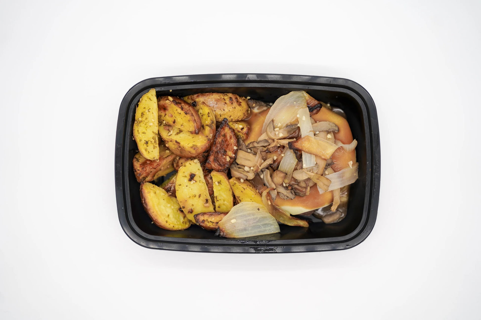 Fresh 90/10 ground beef , layered with swiss cheese, sautéed mushrooms & onions, with a drizzle of light brown gravy. Side consists of crispy oven roasted golden potato wedges.